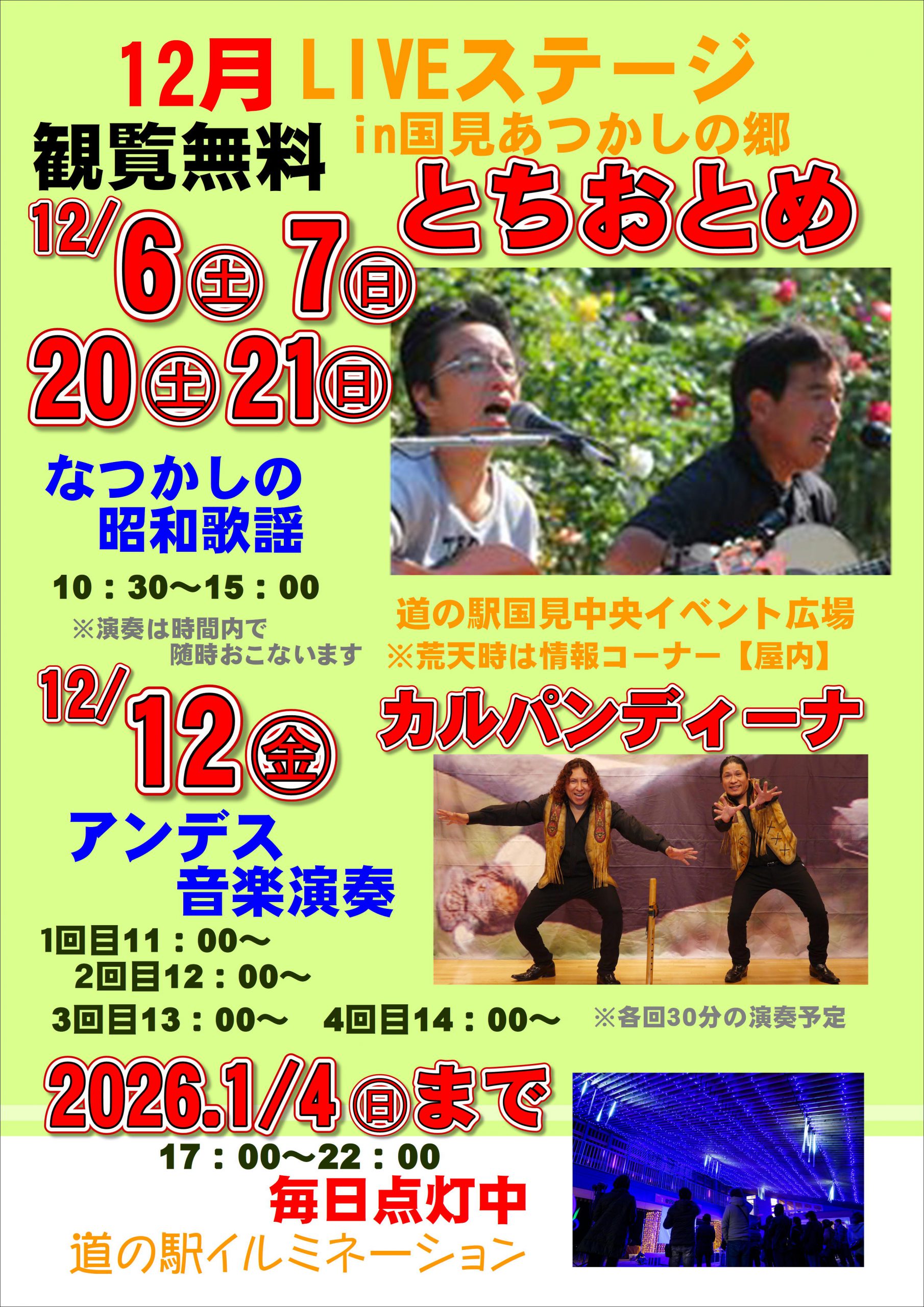 【修正あり】12月LIVEイベント情報について 2025/12/09 ~ 12月 LIVEイベント情報について ~ ※カルパンディーナさん 演奏時間に誤りがありましたので訂正しております ●12/6㊏、7㊐,20㊏,21㊐ とちおとめ LIVE 10:30-15:00 ※時間内にて随時演奏 なつかしの昭和歌謡 ●12/12㊎ カルパンディーナ アンデス音楽LIVE 1回目11:00~ 2回目12:00~ 3回目13:00~ 4回目14:00~ ※各回30分の演奏 詳しくはコチラ ↓↓↓↓↓↓↓↓↓↓↓↓↓↓↓↓↓