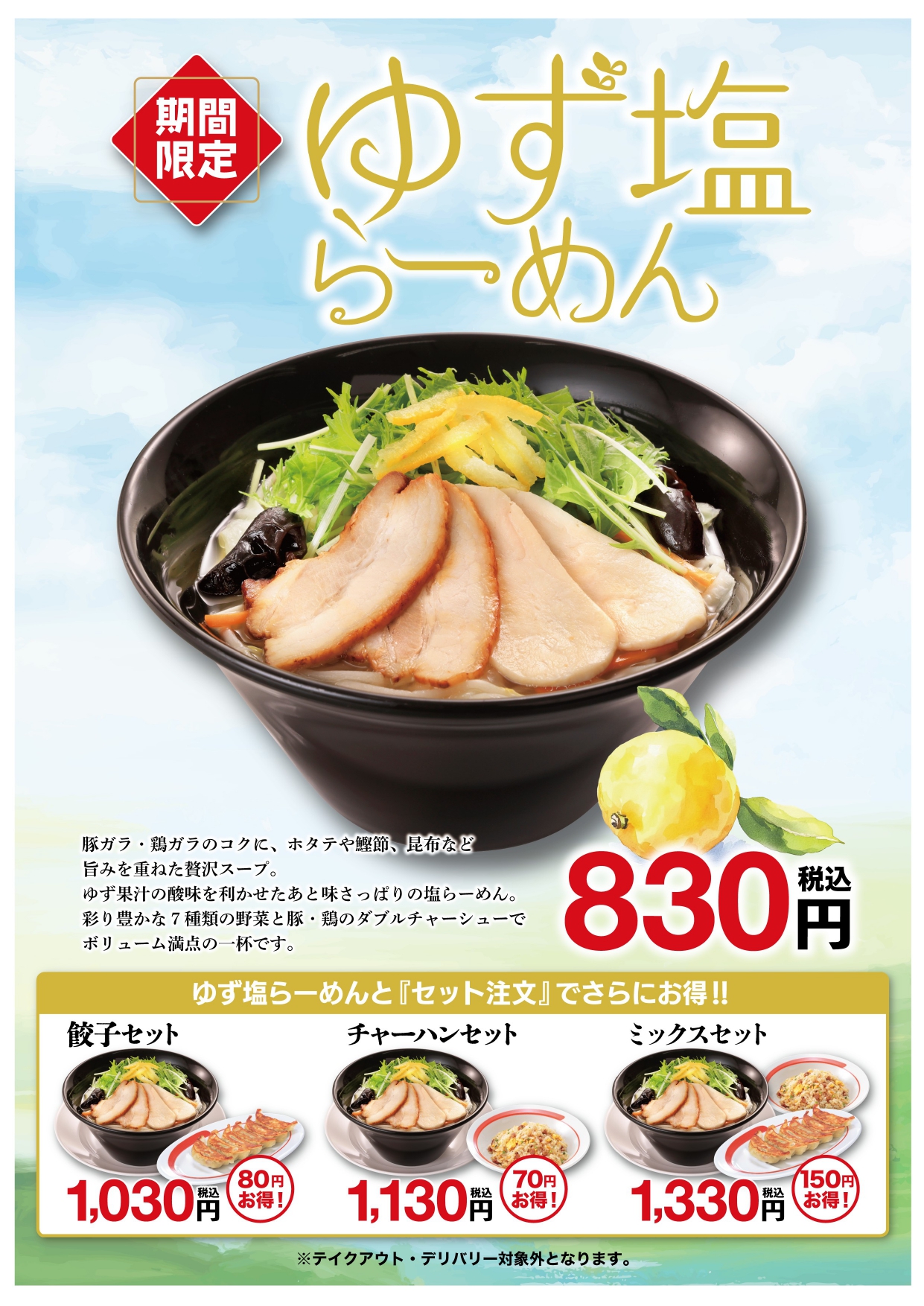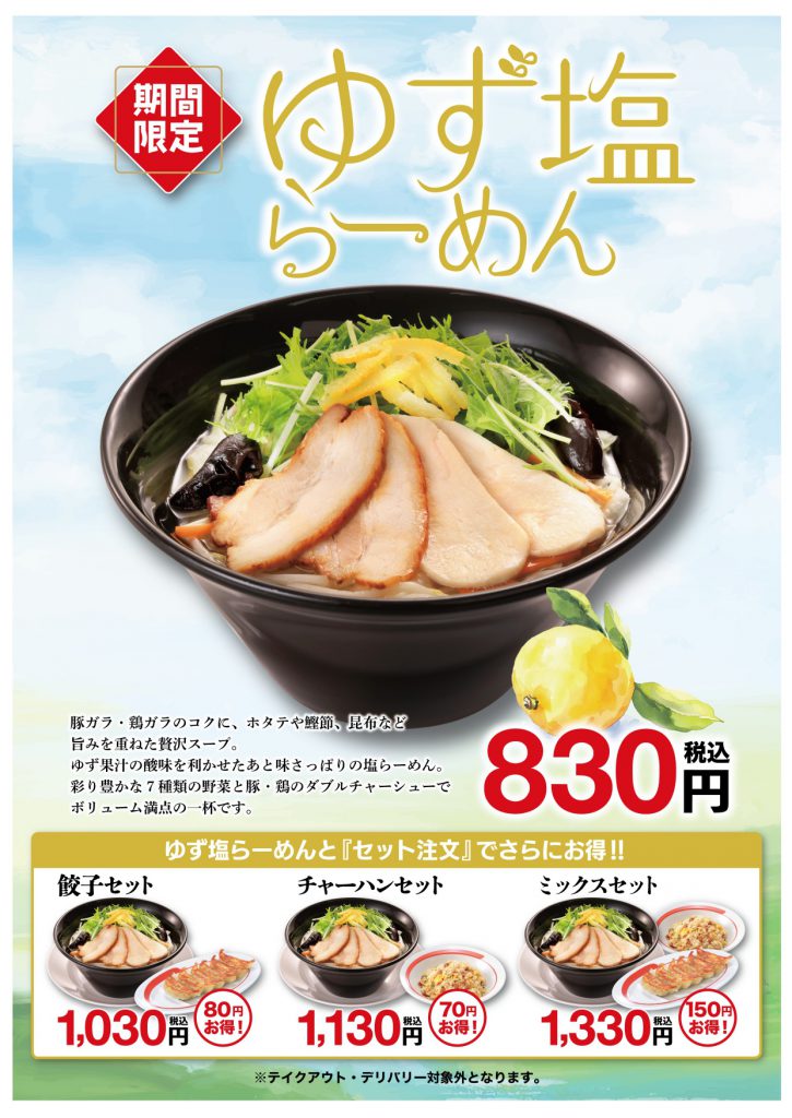幸楽苑 新商品「ゆず塩らーめん」販売について 2026/01/28 幸楽苑から 新商品のお知らせです ■ゆず塩らーめん 830円(税込) 2/2(月)~ 販売開始 ゆず果汁の爽やかな酸味を利かせた、あと味さっぱりスープ。 豚ガラ・鶏ガラのコクをベースに、 ホタテや鰹節、昆布など、海の幸の旨みを重ねたこだわりの味わいです さらに、目にも鮮やかな7種類の野菜に豚・鶏のダブルチャーシューをトッピング ボリュームはしっかりありながらも、最後まで軽やかにお楽しみいただけます